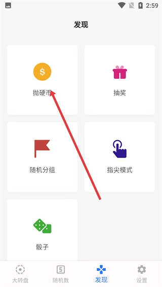 在发现页面找到并点击【抛硬币】按钮,即可进入抛硬币的操作界面,启动随机决策的流程。
