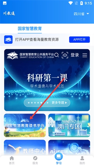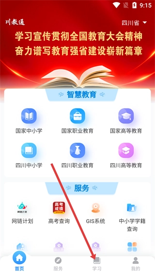 打开【川教通】应用,在首页底部找到并点击【学习】选项,即可进入学习板块。