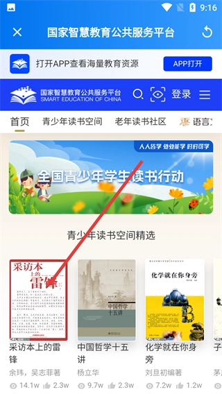 在学习页面,找到【国家智慧教育读书平台】的入口并点击,就能进入该平台。