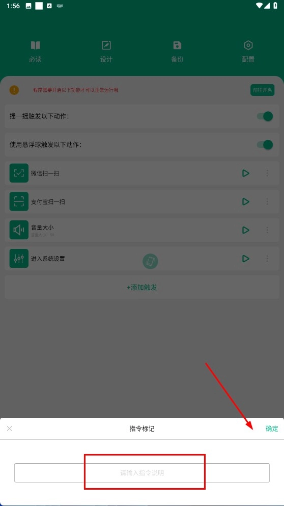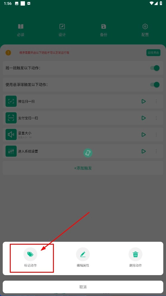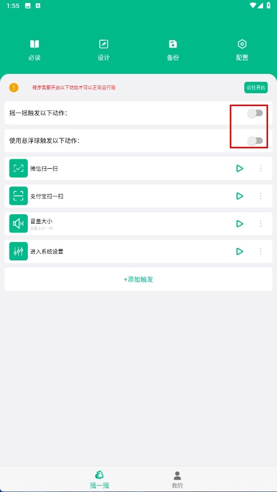 请打开“摇一摇触发以下动作”以及“使用悬浮球触发以下动作”的开关,这样才能保证软件可以正常工作。