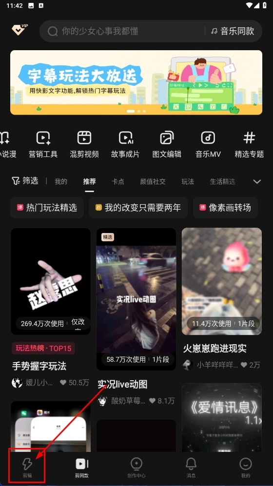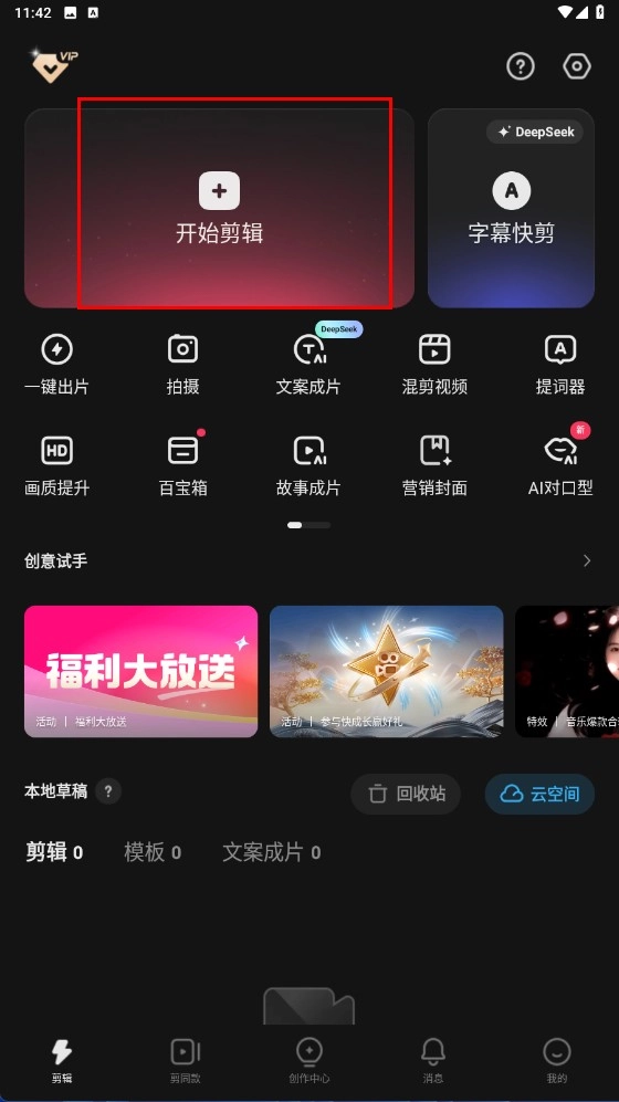 在页面上点击【开始剪辑】功能按钮,即可进入素材选择环节。