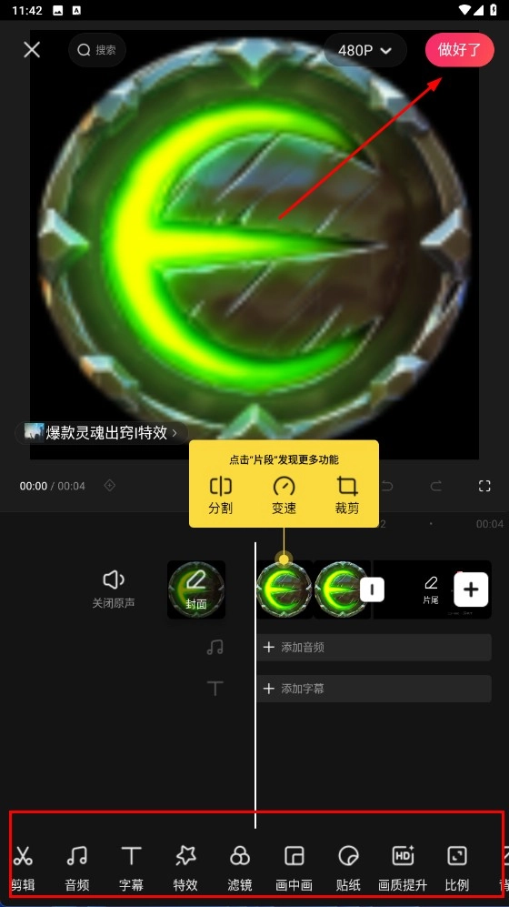 请运用下方的剪辑技能来开展剪辑工作,在编辑任务完成之后,点击【做好了 - 功能按钮】,以此结束剪辑操作。