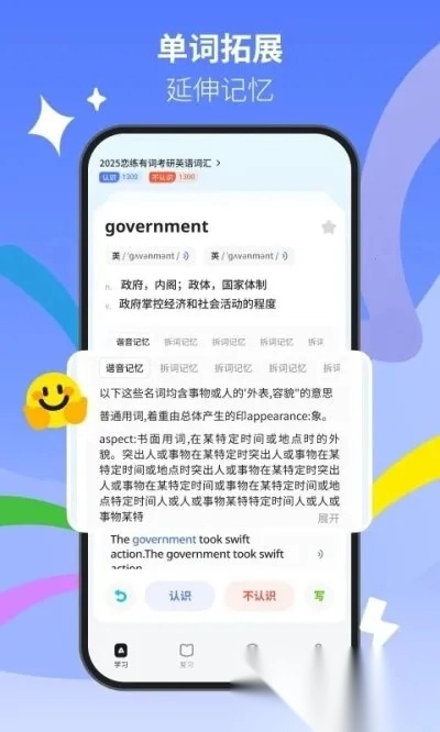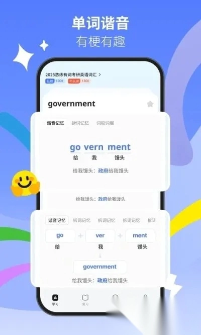 在读音呈现上,它在为每个单词提供详尽释义的同时,也会清晰准确地展示单词的发音。不仅如此,它还配备了谐音助记功能,借助有趣的谐音联想和简短的情景设定,帮助你在轻松的氛围里同时记住单词的读音与含义。