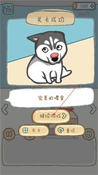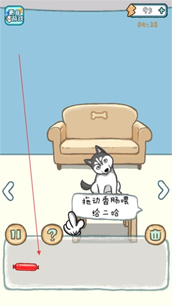 进入关卡后,根据提示把香肠拖过去喂给二哈,只要把屏幕下方的香肠拖到二哈嘴边完成喂食,就能通关。