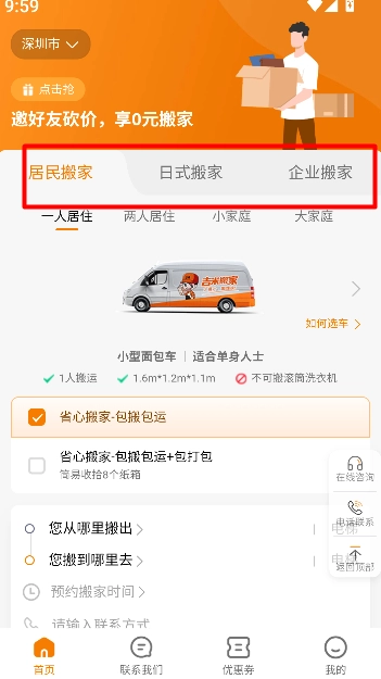 进入首页后选择搬家方式,可从居民搬家、日式搬家、企业搬家等类别中确认适合的搬运类型。