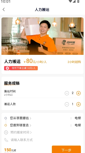 在附加服务里可以选择人力搬运,工作人员会依据实际的搬运量来安排相应的搬运人员,协助您完成全部的搬家流程。
