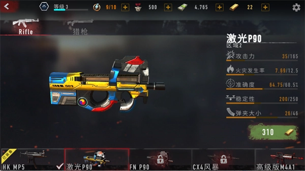 攻击力数值为165,弹夹容量是46发,解锁条件为310金条。整体充满科技感,射速表现极快,是清理群体怪物的得力武器。