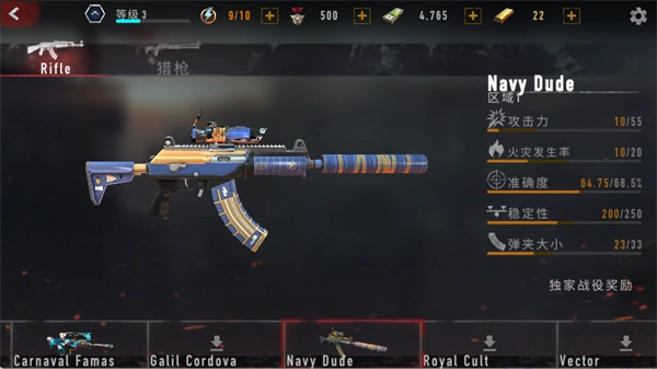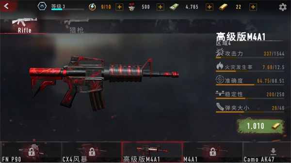 攻击力505,弹匣容量33发,解锁条件为60000现金与600金条。作为中程主力武器,其威力有明显增强。