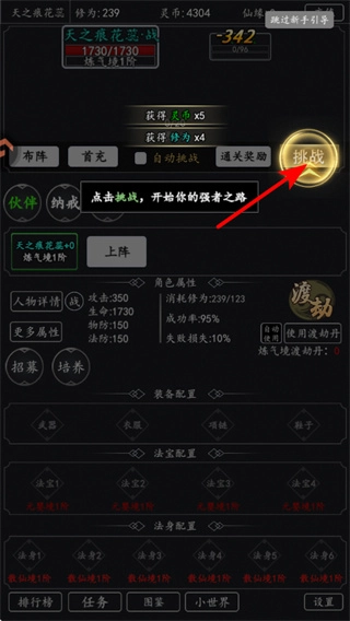 在游戏里点击挑战按钮,就能开启修仙关卡的战斗,这可是提升修为的关键步骤,要留意自身战力和关卡难度是否匹配。