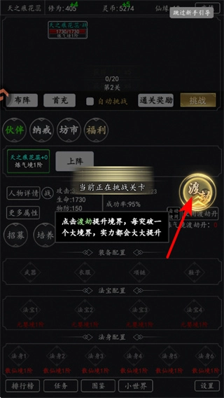 点击渡劫按钮能够提升角色的修仙境界,这是突破战力瓶颈的关键操作,渡劫过程中要保证自身战力足以应对挑战。