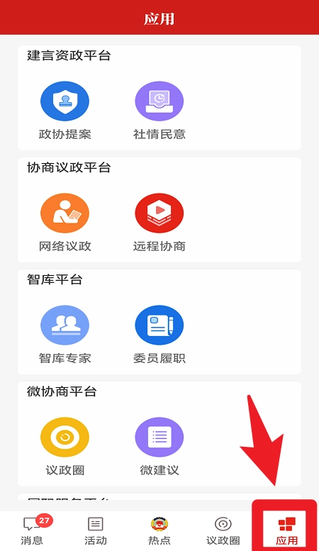 用户点选主页面后,能够进入建言资政平台、协商议政平台等多个政务服务平台,开展民意调查、提出政策建议。