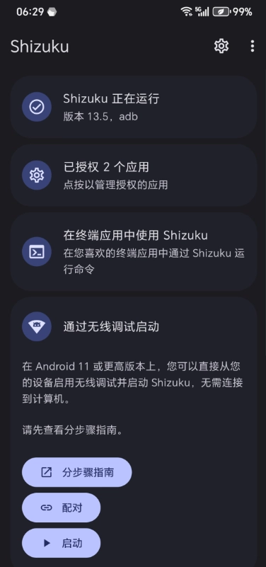输入配对码后,接着打开shizuku,点击启动按钮。