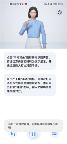 点击中间的耳朵图标就能进行语音识别,说出需要翻译的句子后,上方的虚拟人就会做出对应的手语动作。