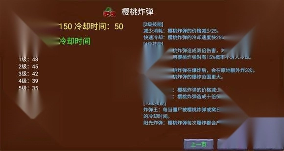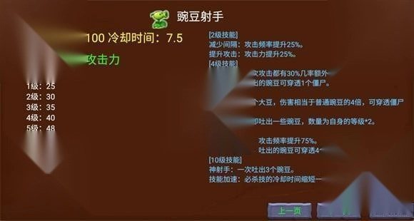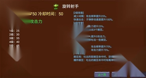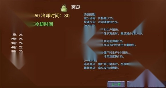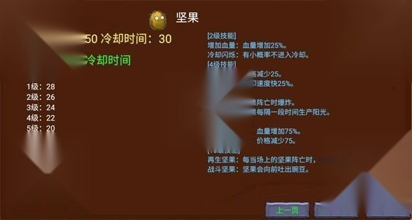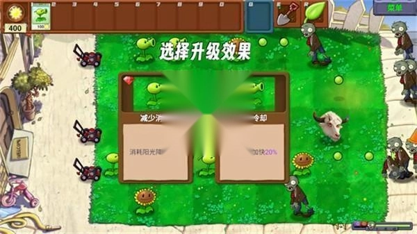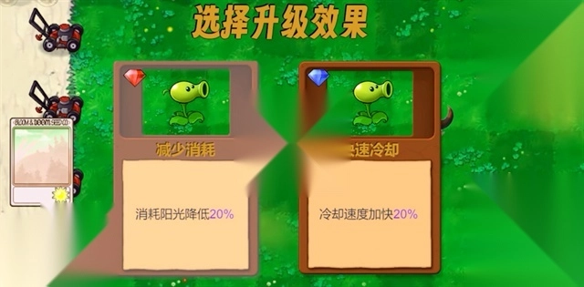 在游玩过程中,玩家可以点击铲子旁边的升级按钮来升级植物,每升两级就能选择选择一个技能,强化时植物的右下角会显示消耗的阳光和强化概率。