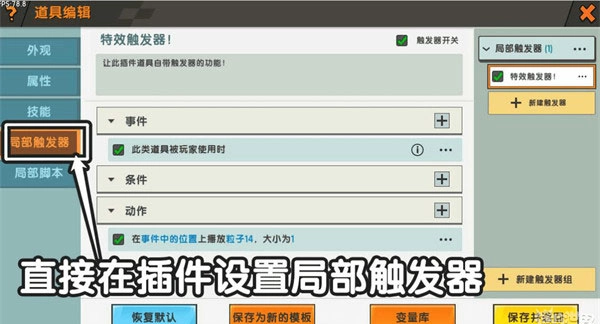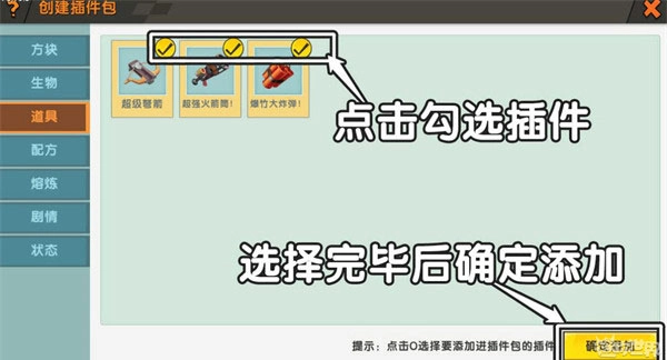 冒险家们还能制作武器、生物、方块等不同类型的插件来组合成插件包,自己创作的微缩模型也能应用到插件里;另外,新版本新增了局部触发器功能,不仅可以直接在插件上设置触发器,还能直接打包呢~