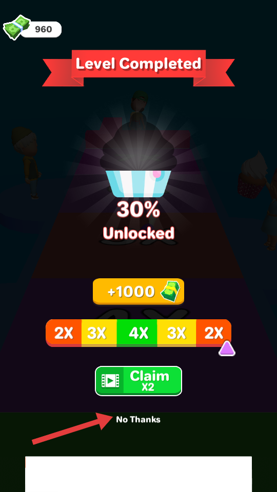 4、关卡完成后,若不想观看广告,点击【No-Thanks】直接领取奖励,解锁新内容。