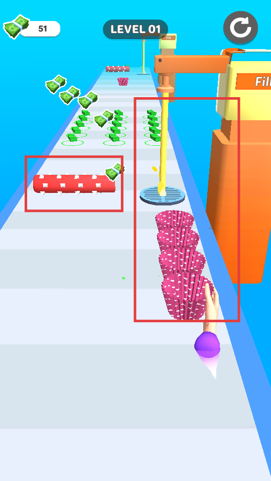 3、避开红色滚筒障碍,将纸杯引导至填充区域,完成蛋糕制作。