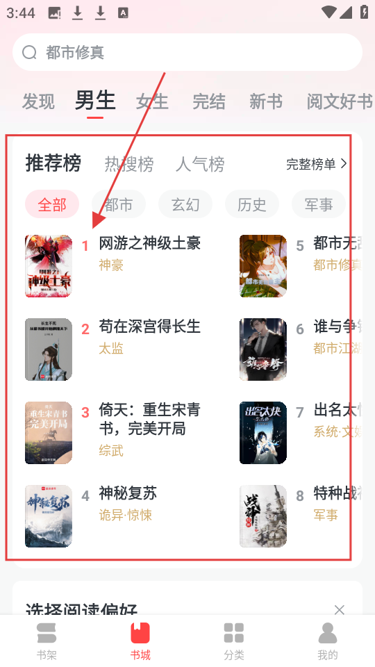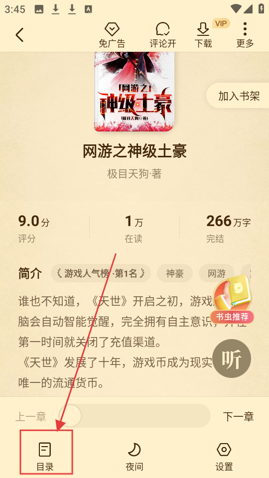 进入书城后,在男生推荐榜单里找到《网游之神级土豪》这本小说,点击进入它的详情页面,就可以准备开始阅读了。