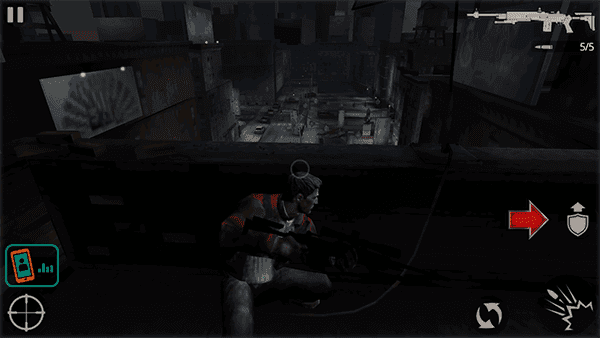 1、安装好杀手2影子阴谋手机版,游戏开始我们将身处天台上,并在一个掩护的状态。点击右侧的盾牌箭头图标,主角将站起离开掩护。