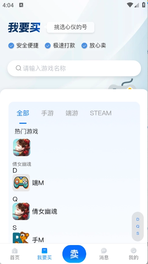 “我要买”页面汇聚了多种游戏账号类型,支持借助关键词开展精准搜索。