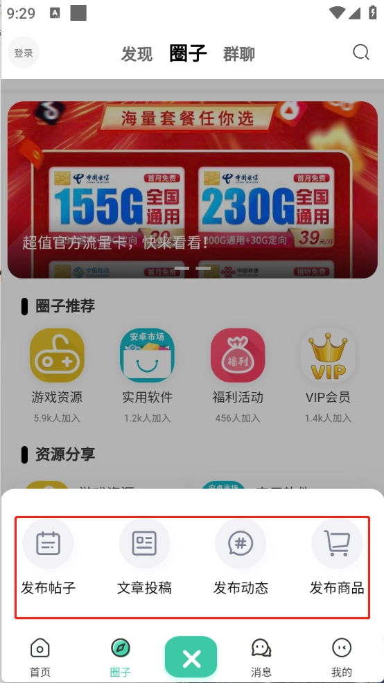 “圈子”板块,你可以加入自己感兴趣的群聊,从而结识更多志同道合的朋友。