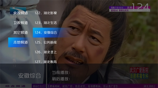 点击屏幕任意位置后,左侧栏会显示众多可供选择的电视频道。