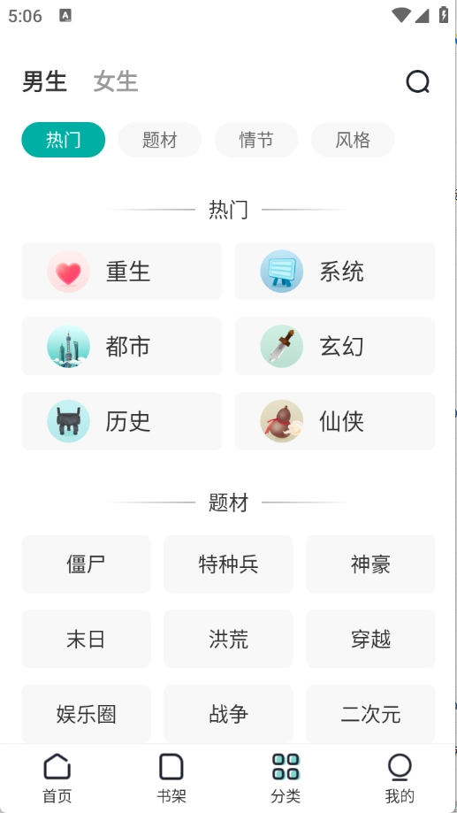 分类页面对小说做了细致的分类,涵盖了言情、武侠和都市等多种类型。
