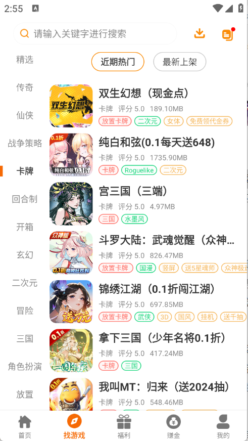 找游戏页面把游戏做了细致的分类,涵盖冒险、仙侠和玄幻等类别。