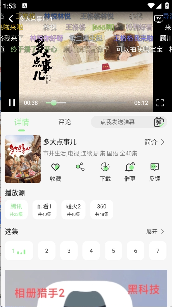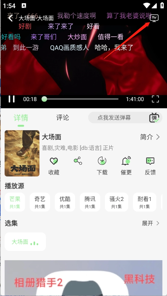 点击想看的影视后进入播放页面,就能查看弹幕、切换播放源和进行全屏播放等操作。