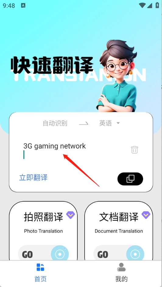 进入后,在搜索框里输入需要翻译的内容,再点击立即翻译按钮。