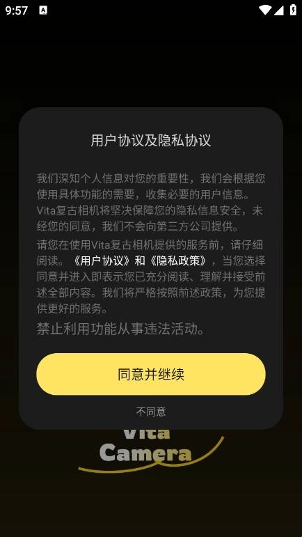首先你需要在本站安装Vita复古相机App,安装完成后打开应用,点击“同意并继续”来授权必要的使用权限,随后即可进入主界面。