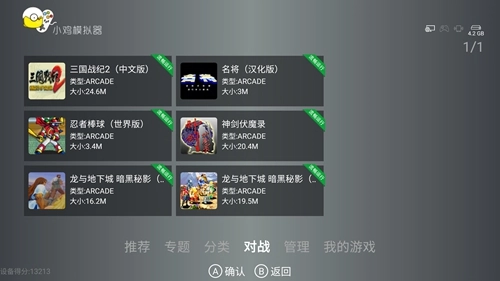 打开小鸡模拟器后进入主界面,画面下方设有6个功能选项,依次为【推荐】、【专题】、【分类】、【对战】、【管理】和【我的游戏】,用户可借助电视遥控器或小鸡手柄完成页面间的切换操作。