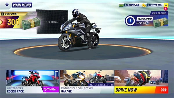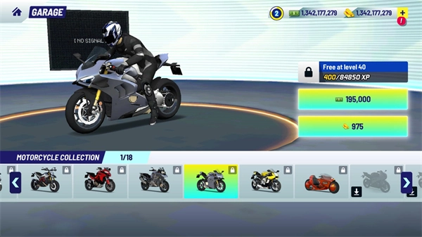 在主界面点击GARAGE按钮就能进入车库,在车库中你可以花费金币解锁各式各样的摩托车。
