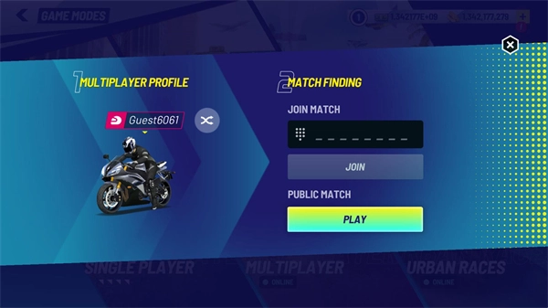 点击后玩家可选择不同的游戏模式,其中第一个为单人模式,第二个是多人模式,第三个是城市竞速模式,后两个模式均需联机才能进行。