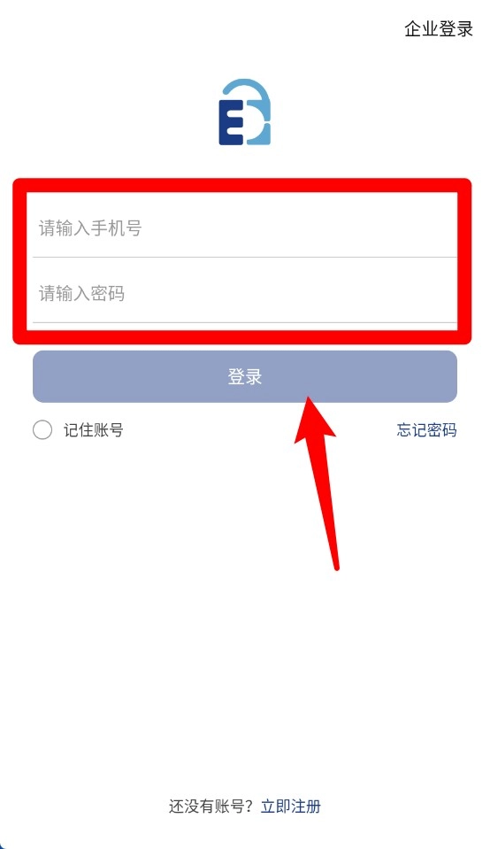 登录页面需通过输入手机号与密码完成企业身份验证,同时提供记住账号功能,以便后续使用更便捷。