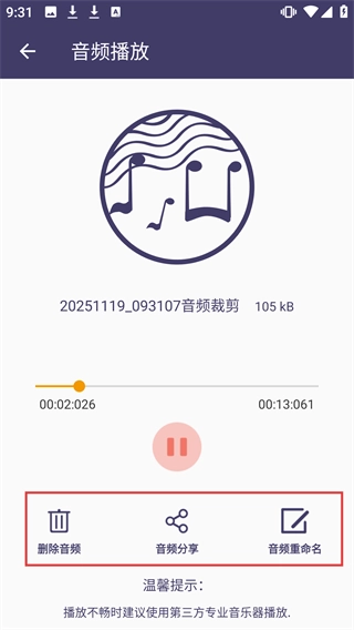 在音频播放界面,你可以对裁剪后的音频执行【删除音频】【音频分享】【音频重命名】等操作,还能直接播放试听。
