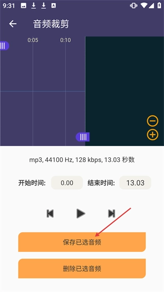 在音频裁剪界面,设定好音频的起始时间与终止时间后,点击【保存已选音频】按钮,即可完成裁剪并保存文件。