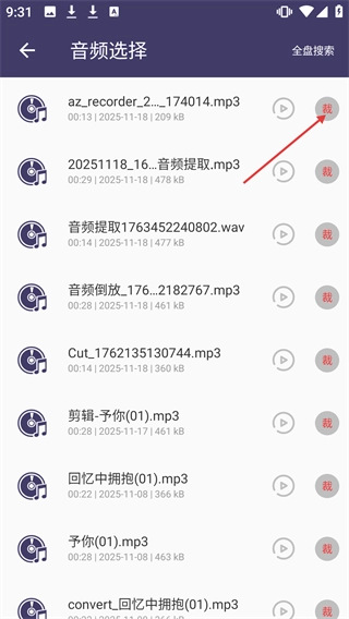 在音频选择界面中,找到要裁剪的音频文件后,点击该文件右侧的【裁】按钮,即可进入裁剪流程。