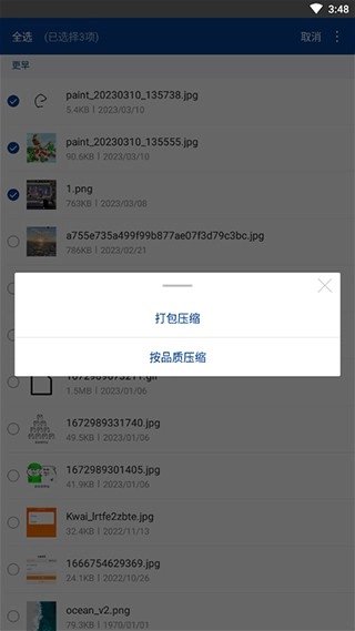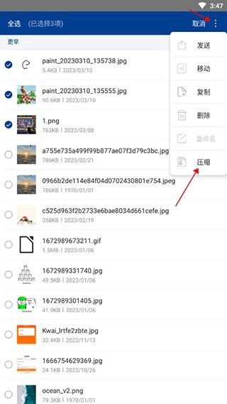 选好图片后,点击右上角的三个点打开下拉菜单,再点击压缩功能。
