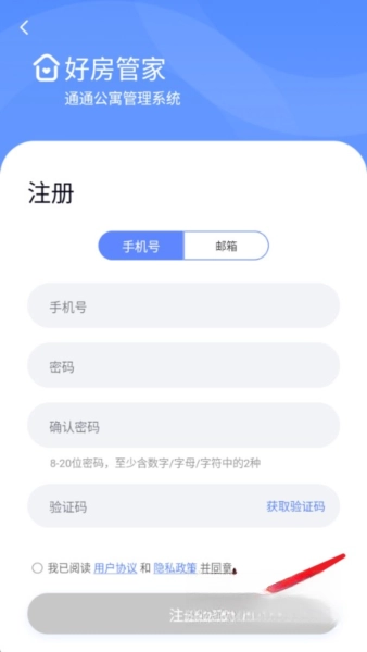 打开好房管家应用程序,输入手机号码与密码进行登录,也可以选择点击注册按钮来创建新的账号。