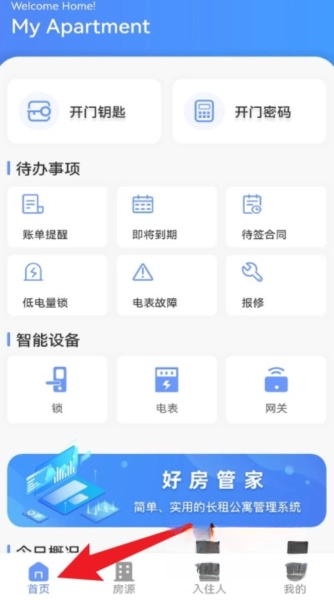 点击底部的“首页”按钮,就能查看钥匙、密码、账单提醒以及设备状态等相关信息。