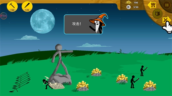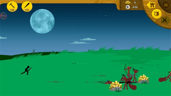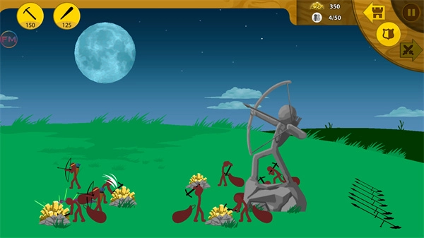 第一关的玩法是这样的:先安排矿工开采矿石,接着训练基础士兵去对付棒槌兵。战斗时先点击攻击,等敌人发起进攻的瞬间立刻选择撤退——由于对手全是弓箭手,用初级兵这样拉扯拖延就能消耗他们。等攒够一定数量的士兵后,就可以集中兵力一波推进。过程中如果有多余资源,记得给矿工配上镐子提升挖矿效率。