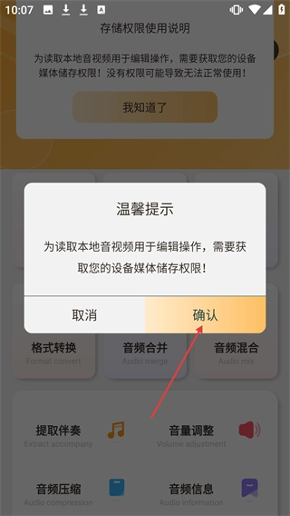 当弹出存储权限的温馨提示窗口时,请点击【确认】按钮,以此获取设备的媒体存储权限,这样才能继续后续操作。