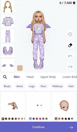 进入形象编辑界面后,可自主更换服饰、发型、配饰等各类装扮,操作完成后点击“继续”按钮即可结束创建流程。