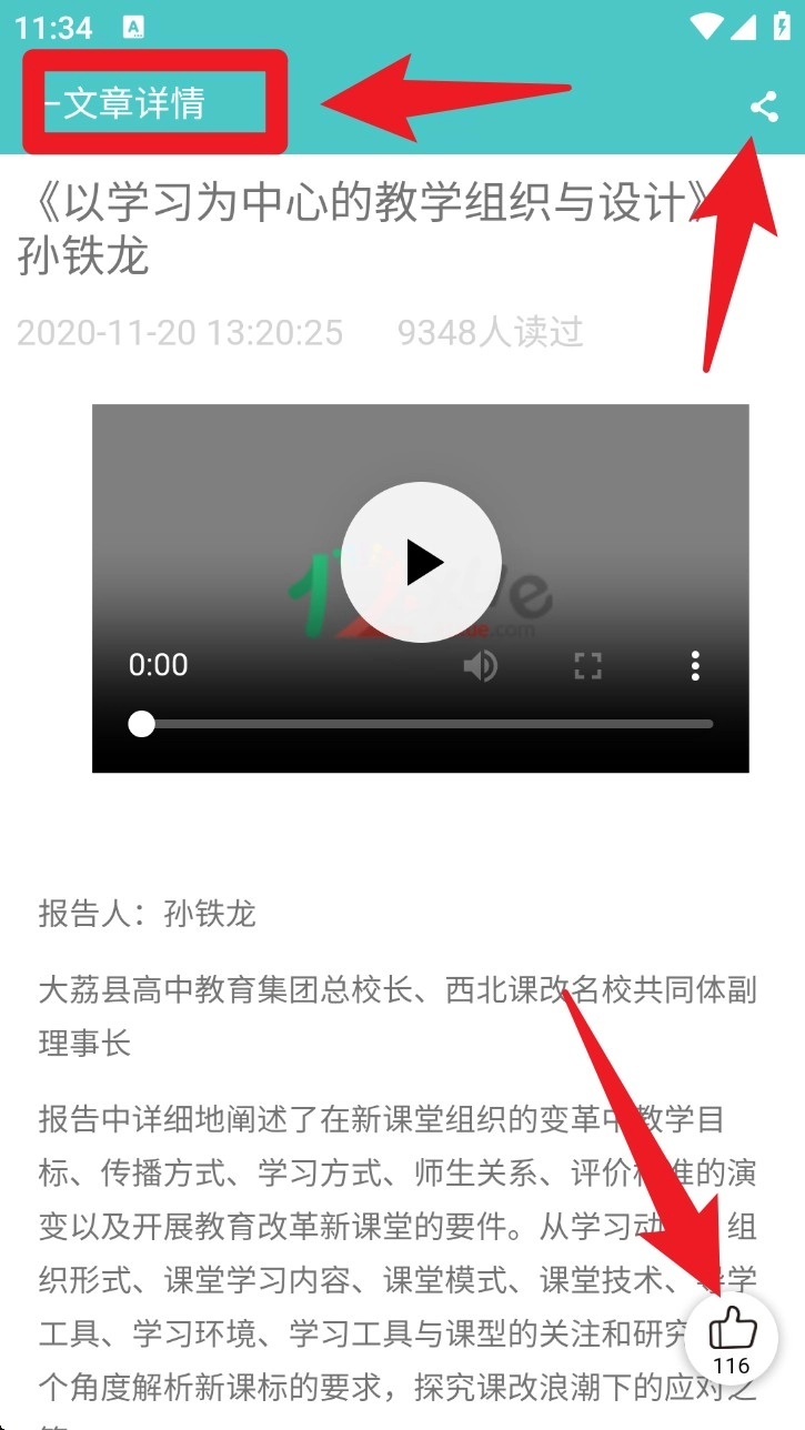 在文章详情页查看报告或教学观点时,你可以点击右上角的按钮进行分享,也能通过点选右下角的图标来完成点赞互动。