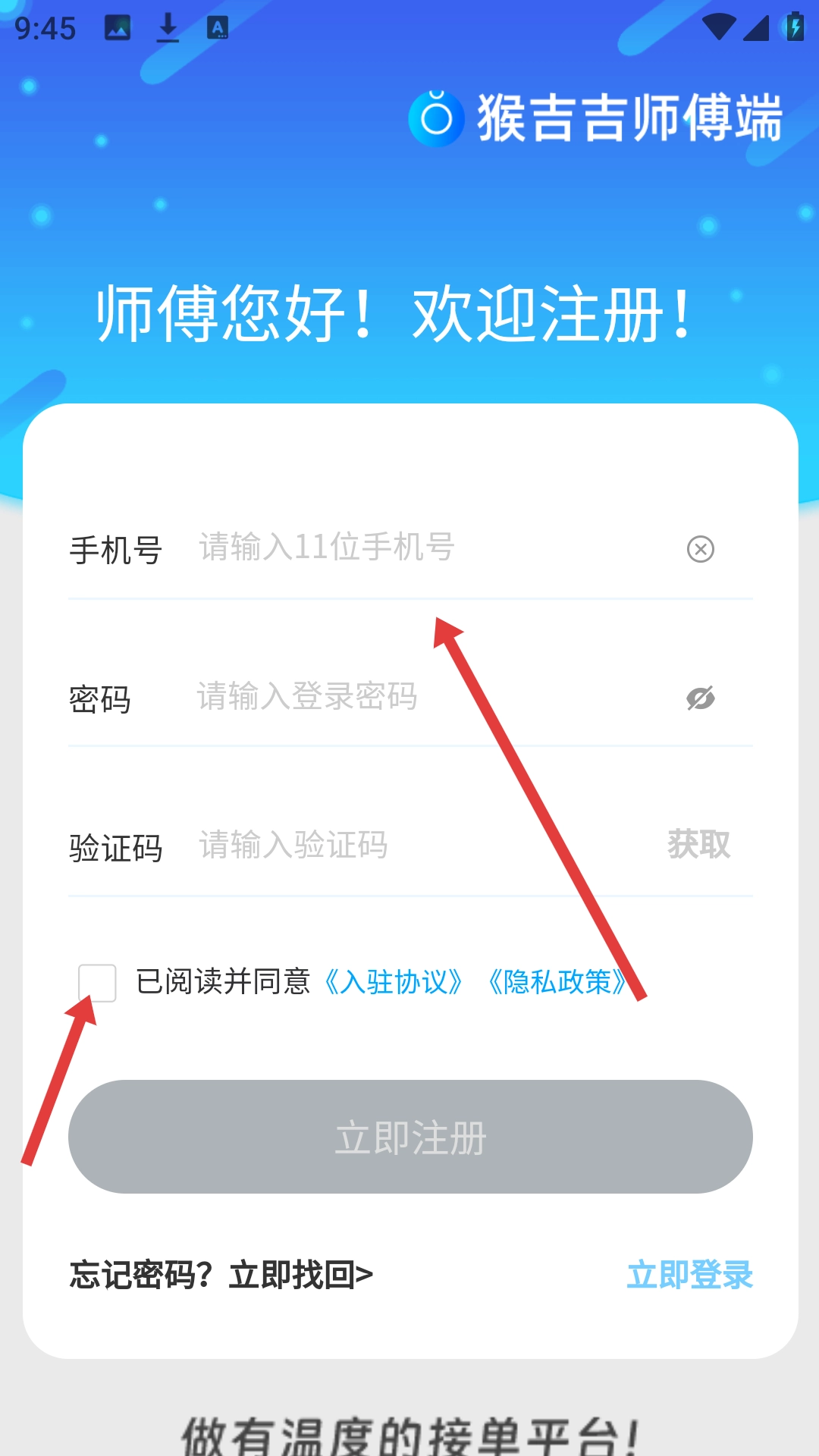 在注册页面输入手机号,并勾选相关协议,完成注册前的准备操作。