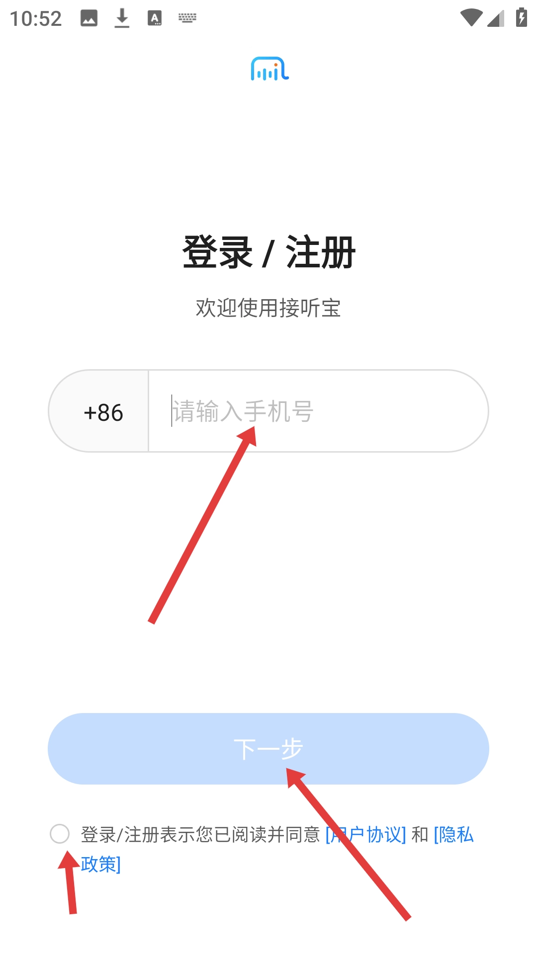 在登录页面输入手机号,勾选相关协议后,点击【下一步】按钮。