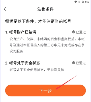 勾选“我已阅读并同意‘注销协议’”后,点击“下一步”按钮。
