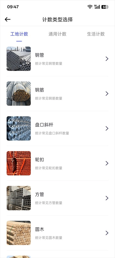 你可以先挑选计数类型,接着通过拍摄照片或者从相册导入图片的方式来进行扫描计数,系统会智能识别图片里物体的数量,像钢管、钢筋、盘扣斜杆、轮扣、方管、圆木、方木这类物品都能支持计算。