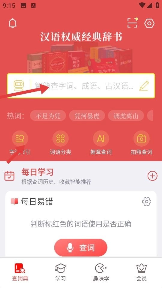 主界面的搜索栏支持字词、成语及古汉语的查询;下方设有字词典、词语分类等实用功能,同时配备每日学习模块,可为汉语学习提供辅助。
